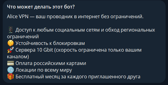 Регистрация в Alice VPN оригинальна. Вам необходимо из-под своего аккаунта зайти в бот, указанный в контактах, после чего запустить его. Перед вами появится приветственное сообщение.