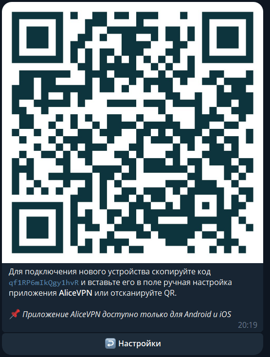 Скопируйте код в раздел подключения в приложении или отсканируйте QR, предоставленный выше. Ваше приложение будет подсоединено к аккаунту с уже активированной подпиской.